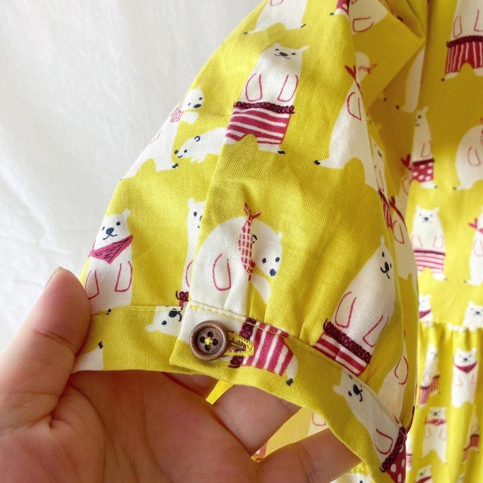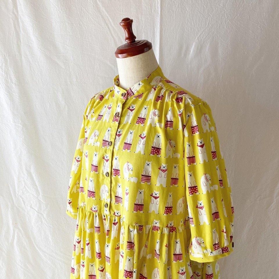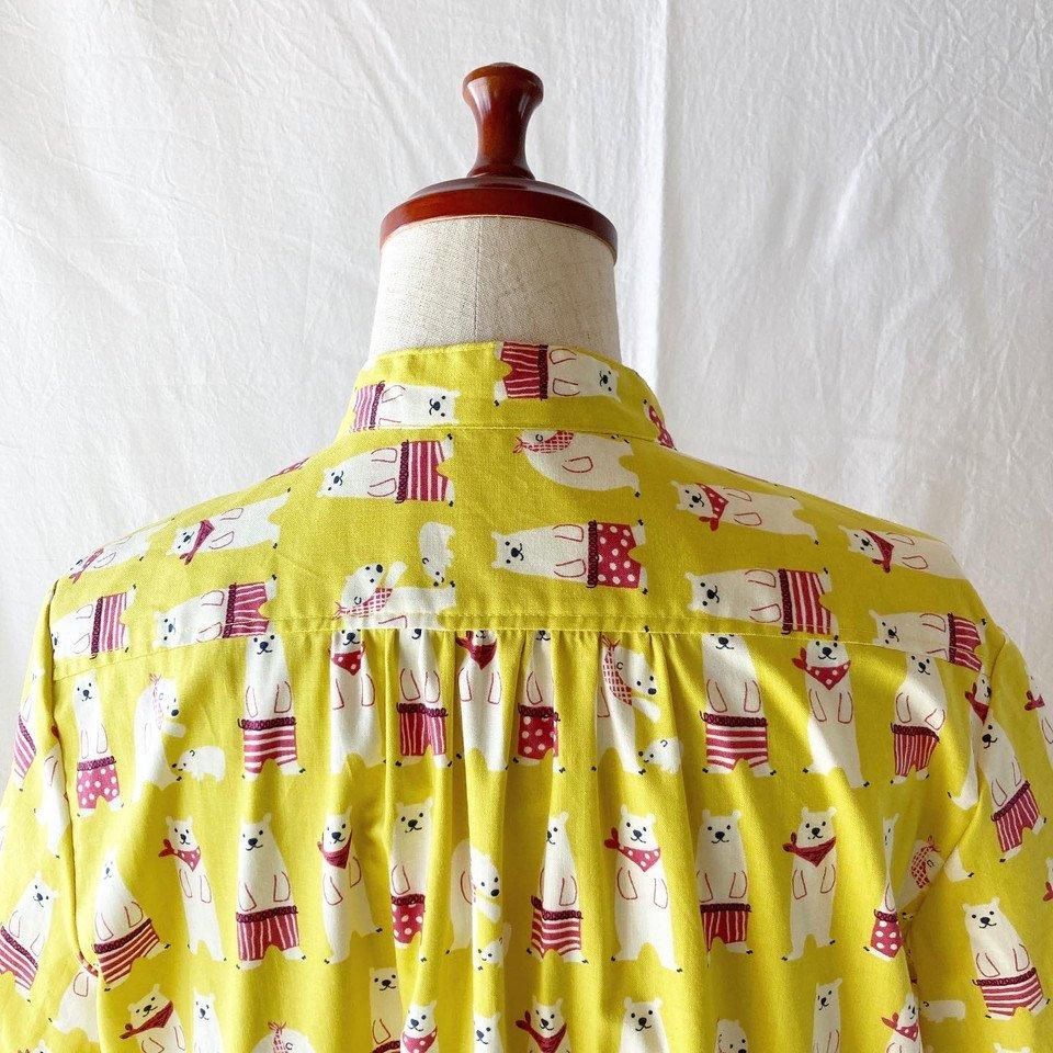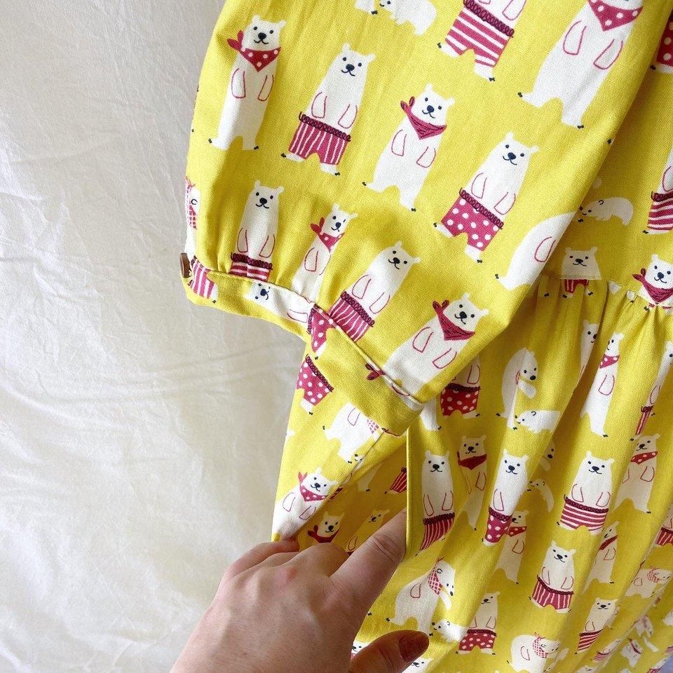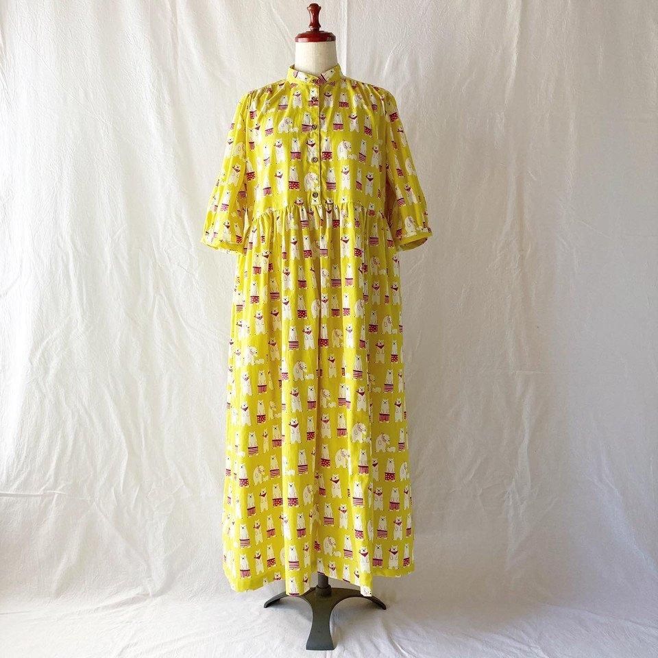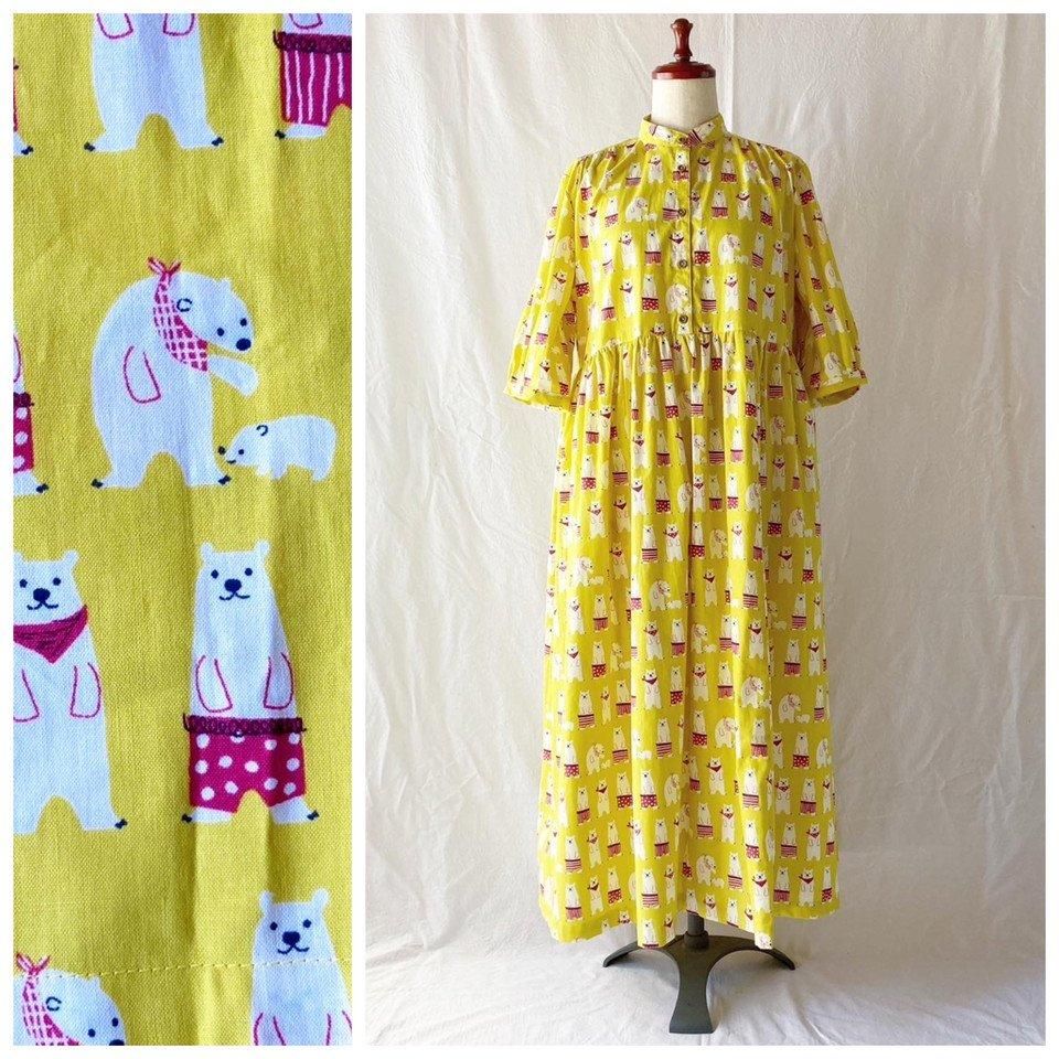 レディのためのプラムワンピース(7分袖):120cm丈(くま:マスタード)