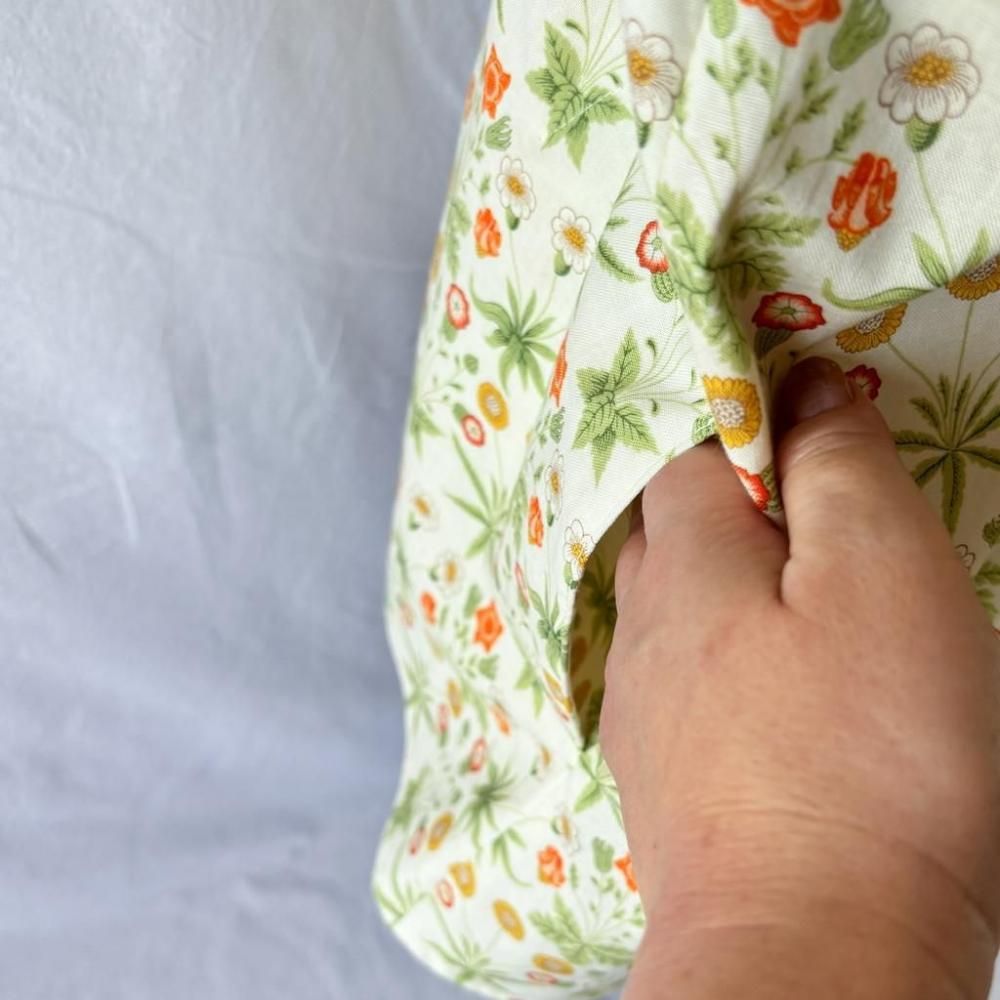 優しくてクラシックな花が、ブラウスの中で風に吹かれて揺れています。