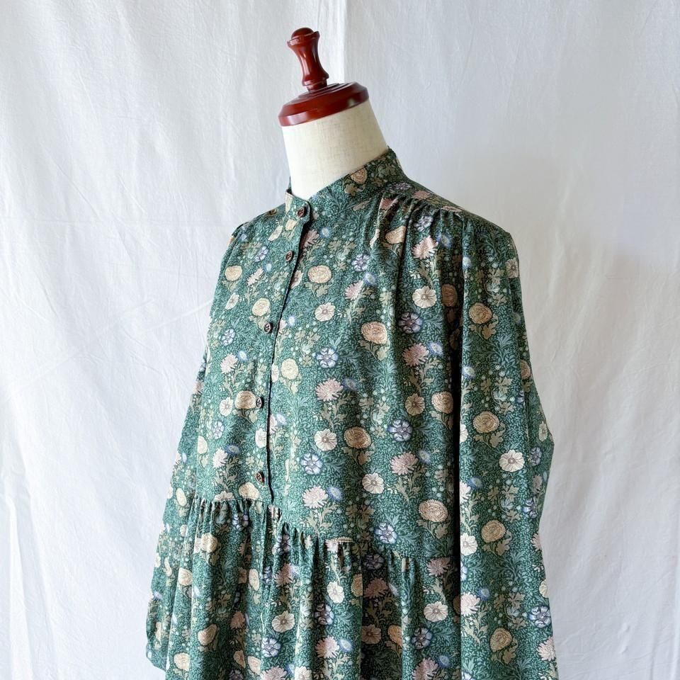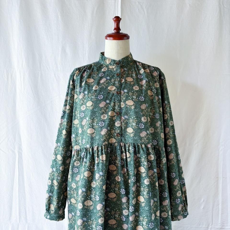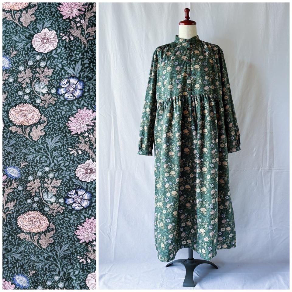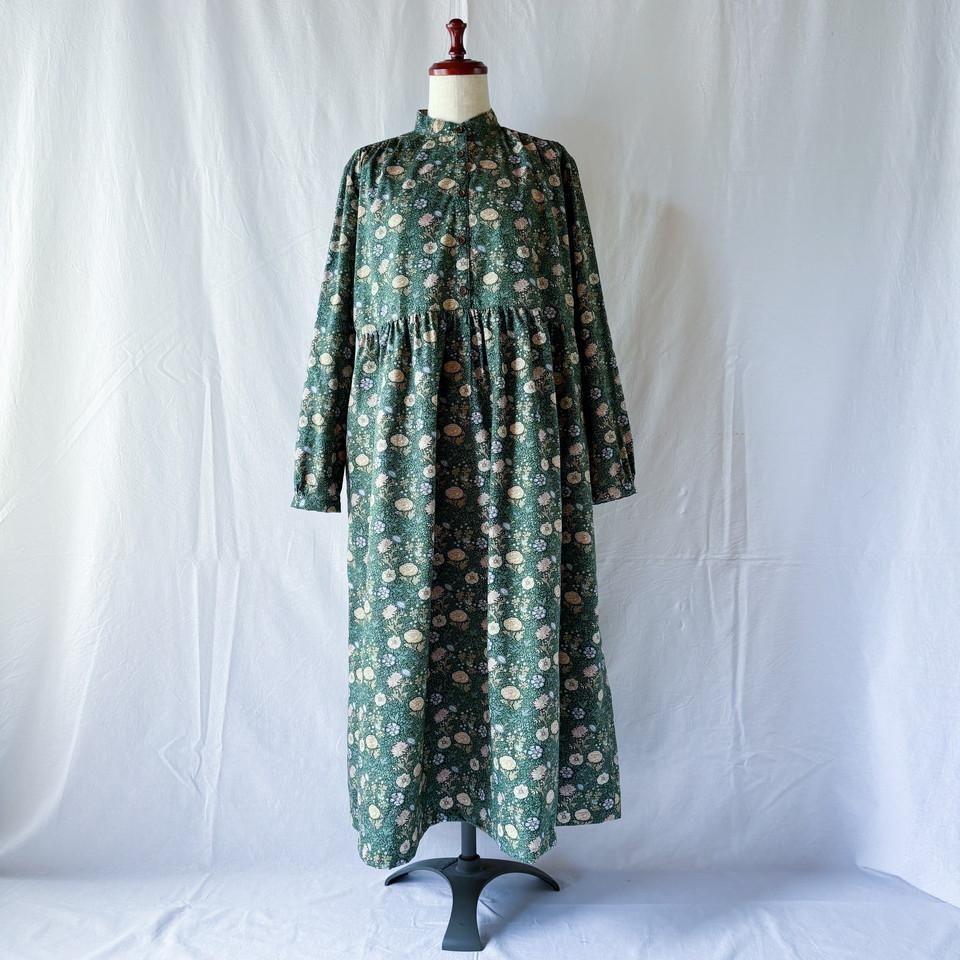 【オールシーズン】レディのためのソルダムワンピース(長袖115cm丈(アンティークフラワー:グリーン)