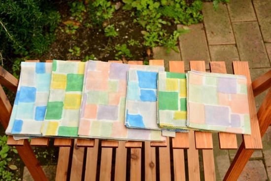 ハンドスタンプが生み出す不思議なリズム。きれいな色のキューブ柄です。